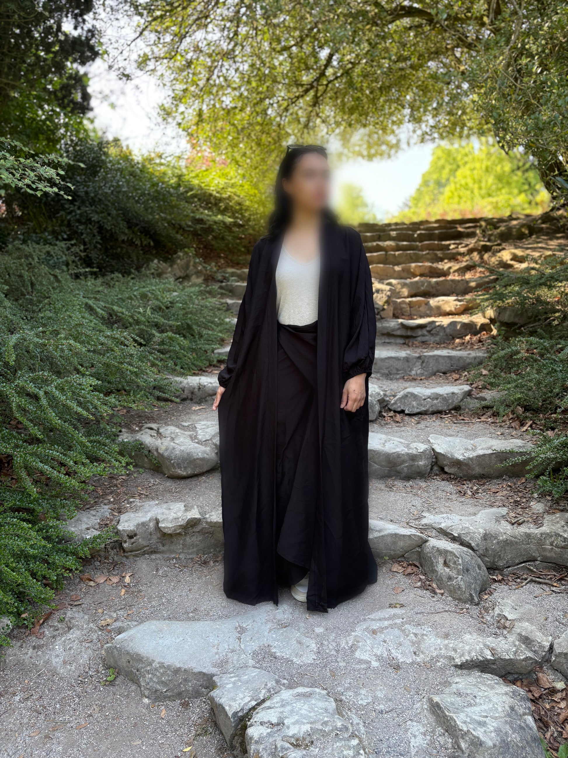 L’Ensemble Inès est composé d’un kimono long (140 cm) et d’une jupe fluide (102 cm), offrant une silhouette élégante et confortable.